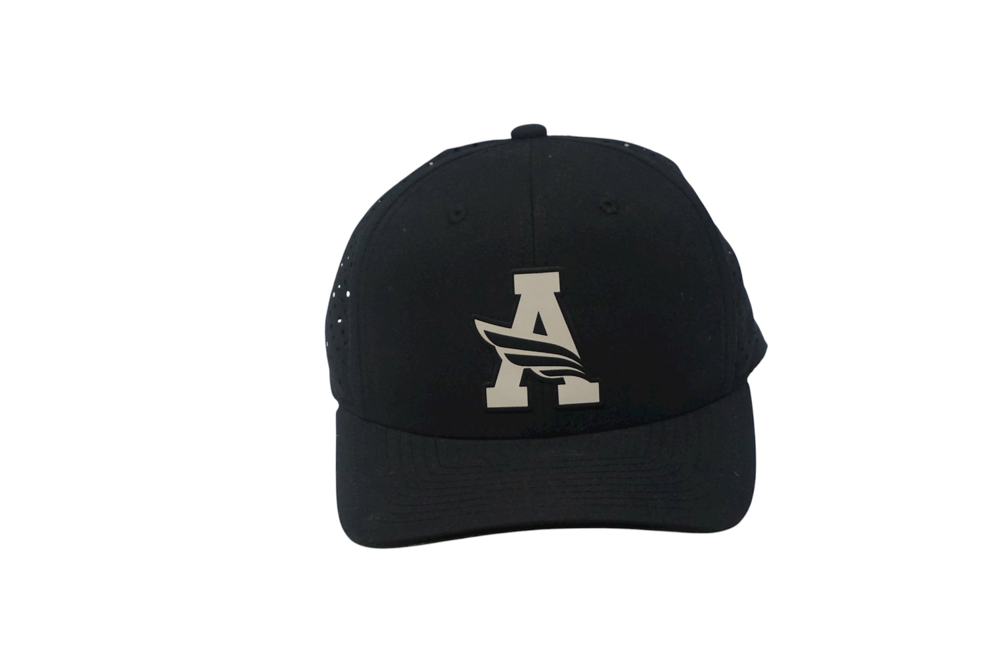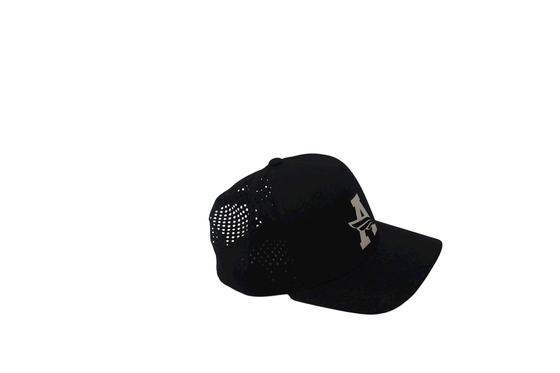 6-panel laser cut performance hat with Argyle's new logo. The white logo shows as white in the light but glows green in the absence of light.